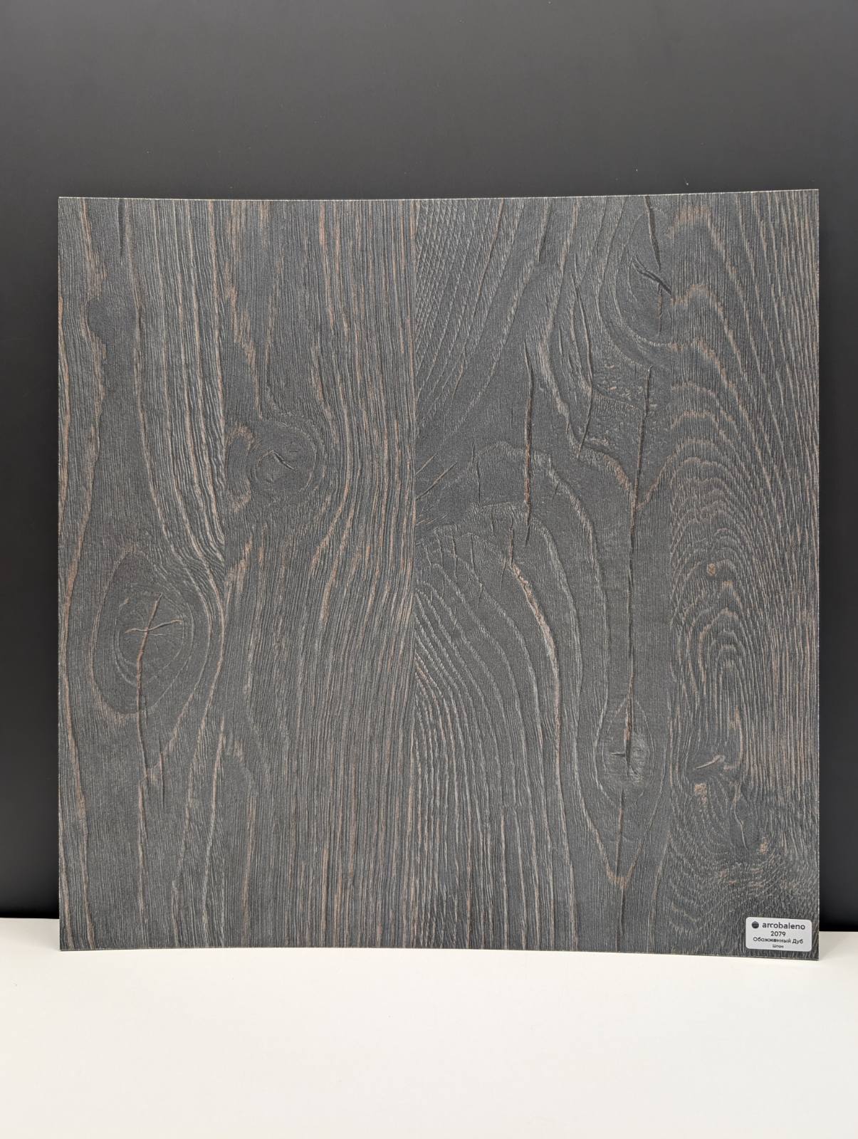 HPL-панели Arcobaleno с текстурой «Обожжённый Дуб» (артикул 2079) представляют собой тёмный древесный декор с насыщенной угольно-коричневой палитрой и выразительным эффектом обугливания. На фоне глубоких тонов видны контрастные прожилки и шероховатые участки, создающие характер обожжённой древесины и придающие поверхности визуальный акцент. Текстура панелей подчёркивает глубину и объём материала, формируя ощущение натуральной древесины с выразительной фактурой.
