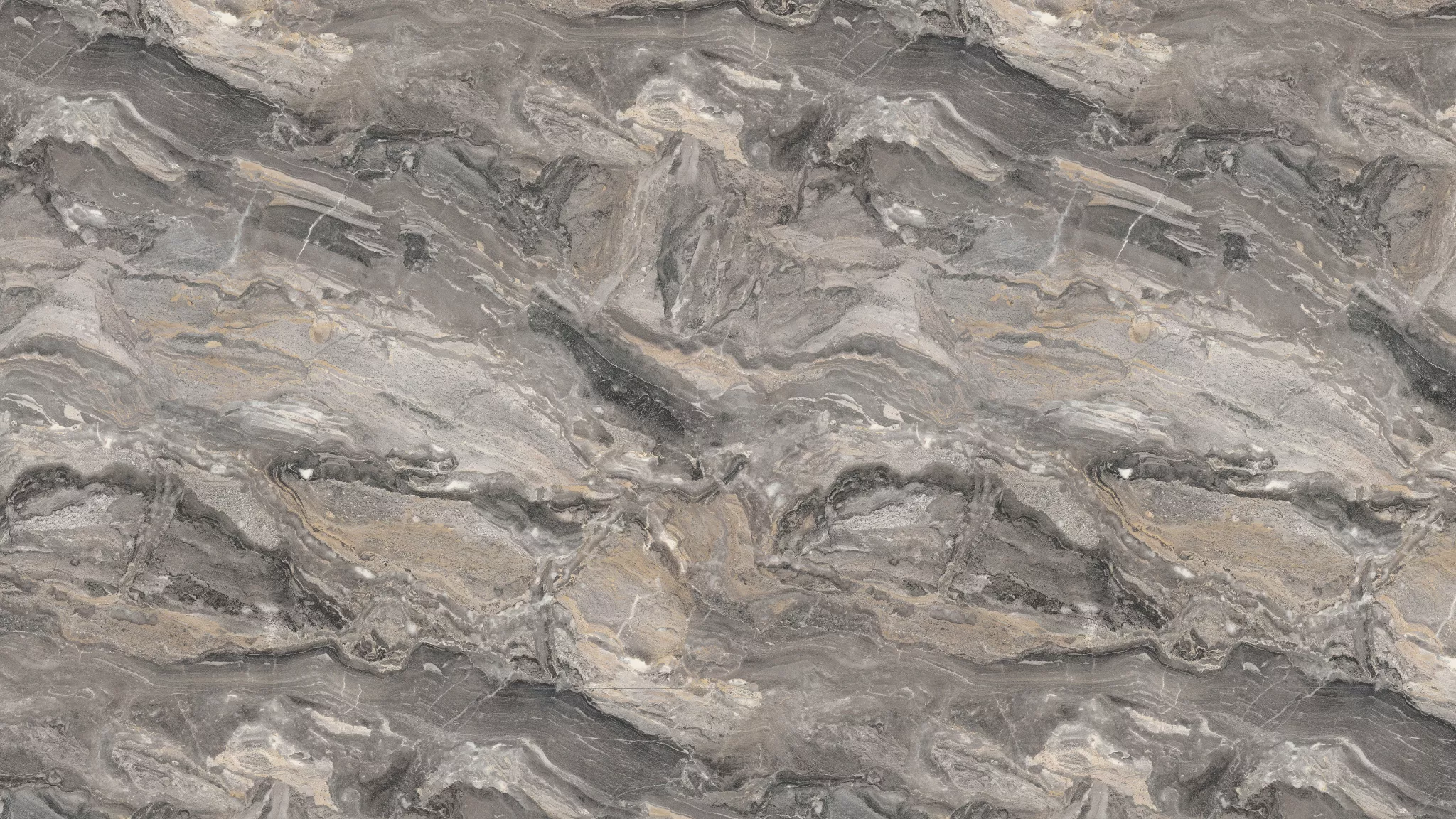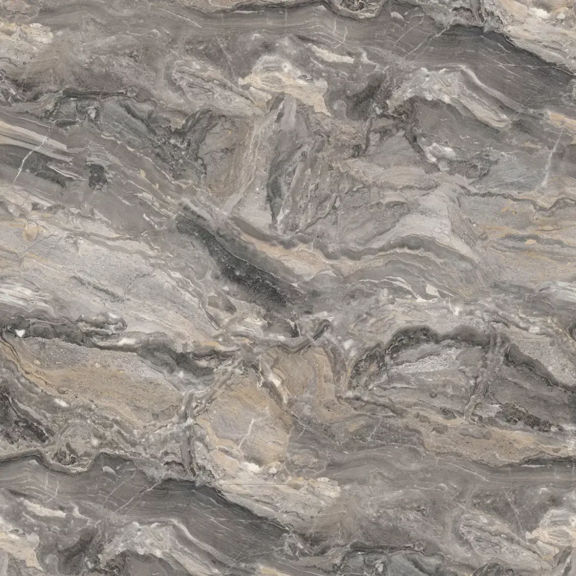 Декор F093 Мрамор Чиполлино серый отличается выразительным рисунком с насыщенными цветовыми переходами, создающими эффект глубины и динамики. Его сдержанная серая палитра включает холодные нейтральные оттенки, дополненные белыми и песочными вкраплениями, что делает текстуру визуально богатой и многослойной.